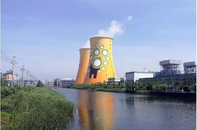 这个最美的“冷却塔”,是浙江火电承建的滨海热电一期工程去工业化改造EPC项目。共有两座冷却塔,每座高115米,单塔淋水面积5500平方米。冷却塔体量较大,是此工程中最显眼的构筑物,而本次改造将在冷却塔上进行色彩美化。底色为鲜明的橘红色彩,从下往上做明度的渐变,在沿江面的底色之上绘制卡通树形图案,象征电厂是整个蓝印小镇的能源之树,显示出从电厂这个“树干”向印染企业这些“树叶”源源不断地输送能量。