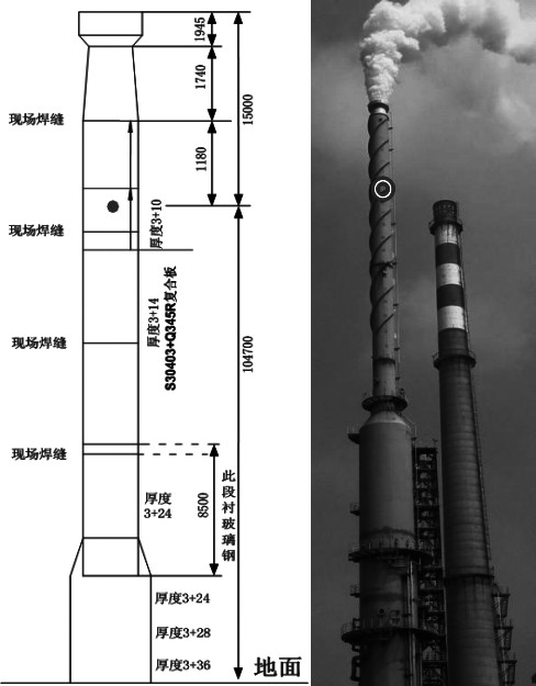 2016年6月27日,烟囱东侧离地面105米处出现腐蚀穿孔,穿孔部位在筒体环焊缝上部约300mm处(如图1所示),该处筒节壁厚为3+14mm。